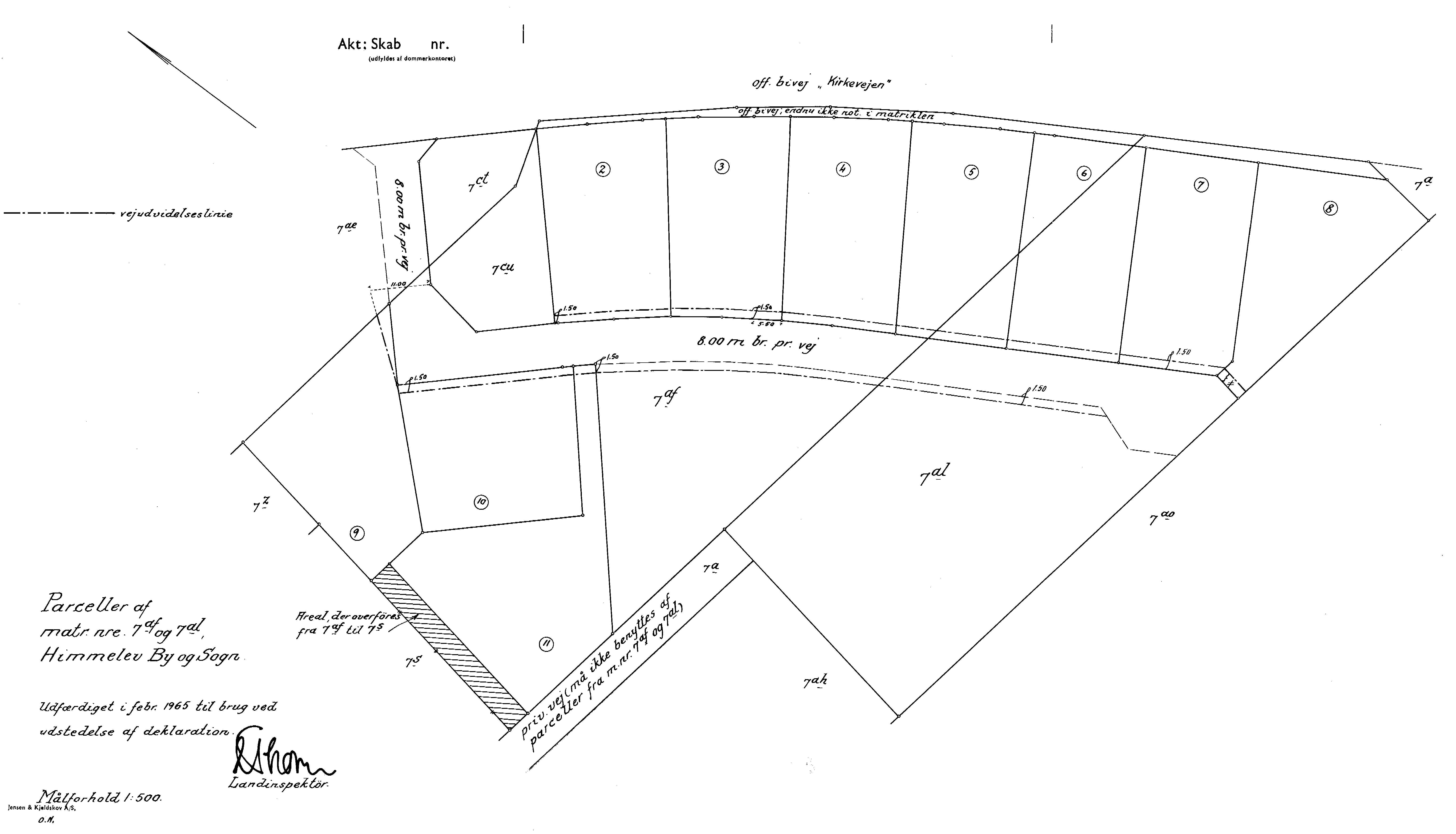 Enhver adgang til parcellerne skal ske ad den 8 m brede private vej, som er udlagt over matr.nr. 7 ae smstds. og er optaget på matrikelkortet. Anden færdsel - herunder også gående - fra ejendommen ud på den offentlige bivej "Kirkevejen" er ikke tilladt, hvorfor det pålægges købere og fremtidige ejere af parceller, som grænser til "Kirkevej", at etablere og vedligeholde et mindst 1 m højt fast hegn uden låger i skellet mod denne vej.
