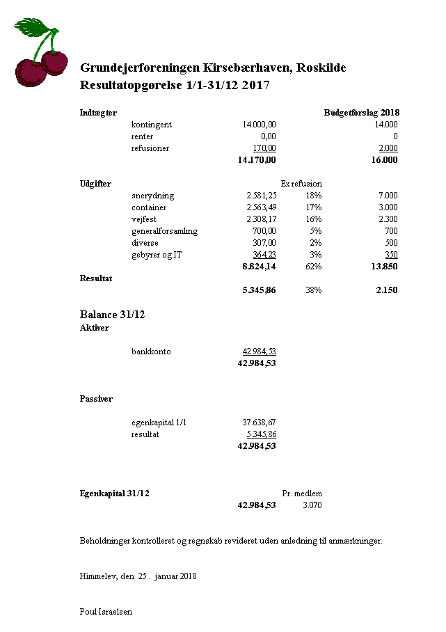 Forelæggelse af budget og fastlæggelse af kontingent for 2018